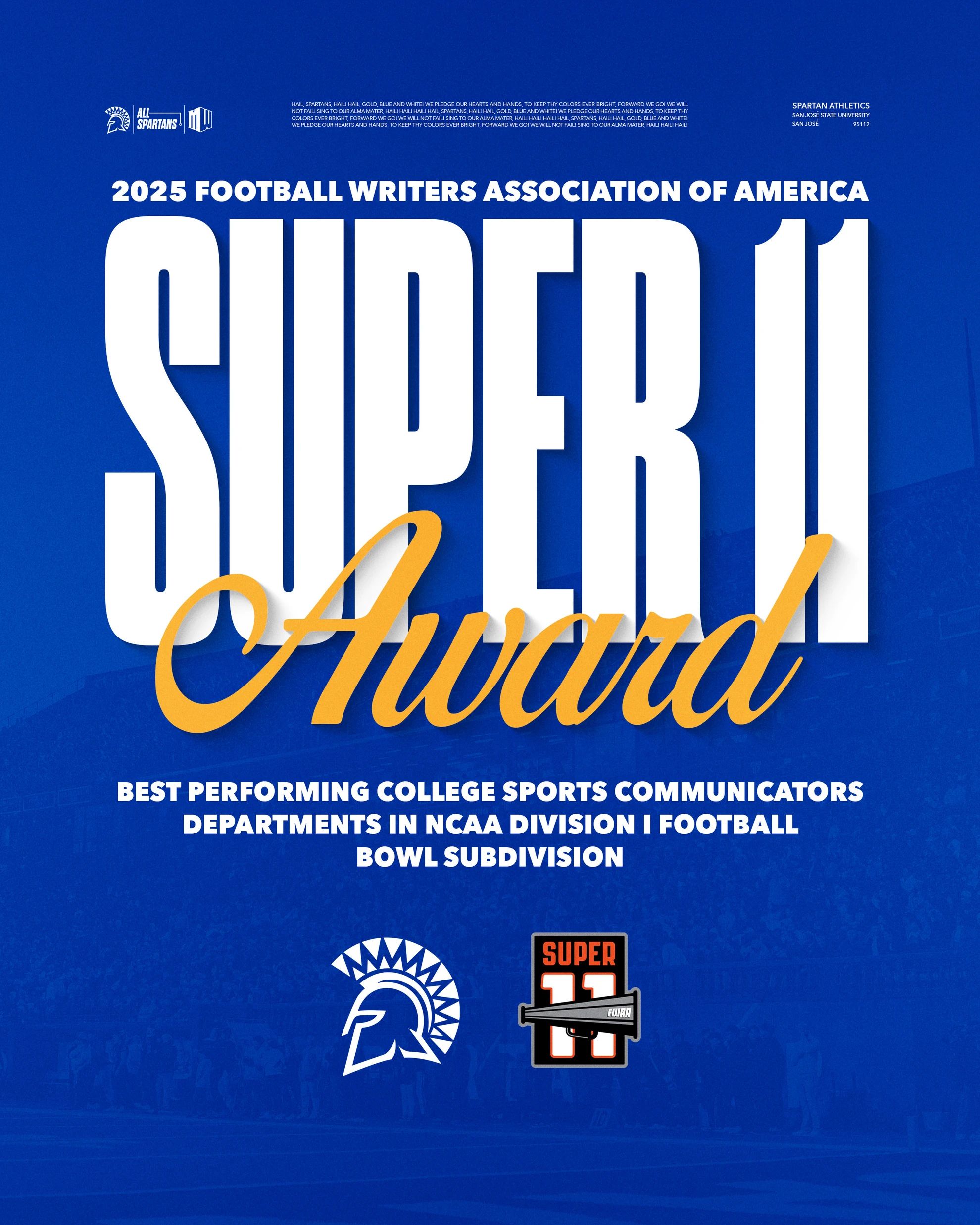 Good Morning, SJSU Fam. The Football Writers Association of America (FWAA) announced Thursday that the San José State football media relations staff has been selected as a recipient of the 17th Annual Super 11 Awards, recognizing the best-performing College Sports Communicators departments in the NCAA Division I Football Bowl Subdivision (FBS).