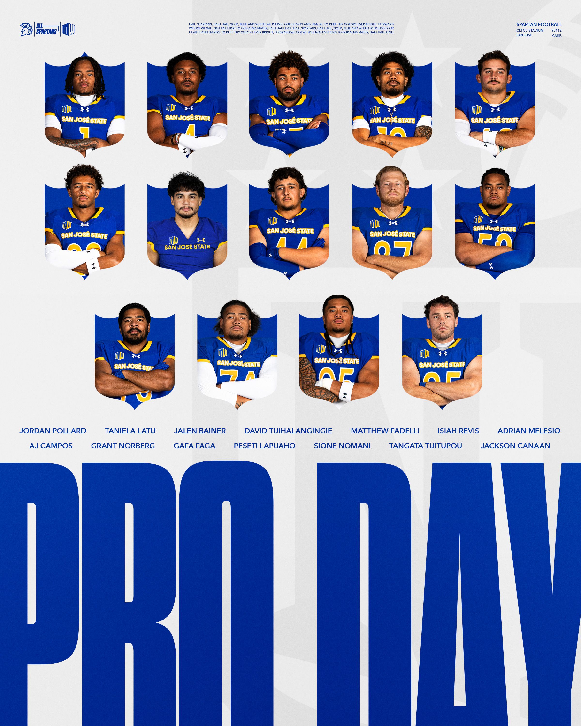 🔼 Pro Day! SJSU’s Pro Day is today! Jordan Pollard, Jalen Bainer, AJ Campos, Jackson Canaan, Matthew Fadelli, Gafa Faga, Peseti Lapuaho, Taniela Latu, Adrian Melesio, Sione Nomani, Grant Norberg, Isiah Revis, David Tuihalangingie, and Tangata Tuitupou will participate. The event will take place at 2pm at CEFCU Stadium. Pro Day is free and open to the media and public.