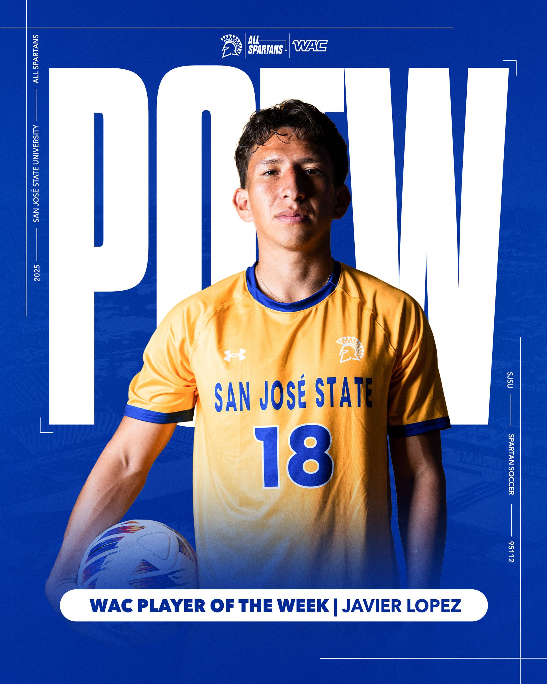 SJSU men’s soccer standout Javier Lopez was named WAC Defender of the Week on Tuesday, which marks his first career player of the week award and the sixth player of the week award of the season, extending a program record.
